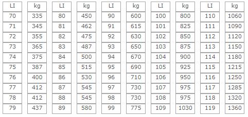 A táblázatban megadott kg értékek normál kivitelű abroncs esetén és 2.5 bar, erősített kivitelű gumiabroncsok estén 2.9 bar keréknyomás esetén érvényesek. Kisebb keréknyomás alkalmazása esetén a gumiabroncsok terhelhetősége értelem szerűen kisebb!