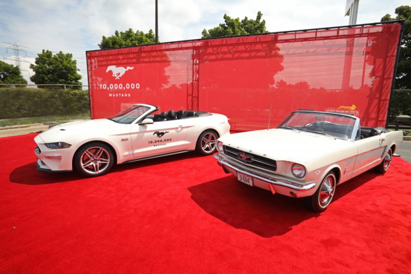 A 10 milliomodik Ford Mustang egy high-tech kivitelű, 460 lóerős, Wimbledon White fényezésű GT V8 változat; a hatfokozatú manuális sebességváltóval és a legújabb vezetősegítő technológiákkal felszerelt kabrió a Ford michigani Flat Rock összeszerelő üzemében gördült le a gyártószalagról. A legelső sorozatgyártású, 001-es alvázszámú Ford Mustang 1964-ben készült el ugyanilyen színben és kivitelben, és az autó 164 lóerős, V8-as motorjához háromfokozatú manuális sebességváltó kapcsolódott.