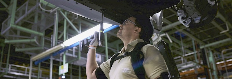 A futurista öltözék kicsit arra emlékeztet, amikor Tony Stark szuperhőssé változik – csakhogy a Ford üzemében nem a Vasember áll a szalag mellett, hanem olyan emberek, akiknek hasznos, ha munka közben egy eszköz megtámasztja a vállukat és a hátukat, áthelyezve a terhelést a csípőjükre, ezzel is csökkentve a munkából eredő sérülések esélyét.