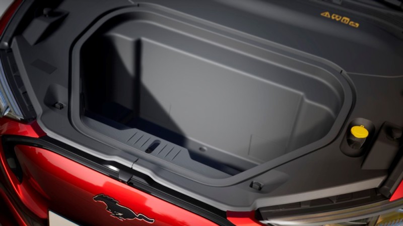 A Mustang Mach-E másik meglepetését a motortér rejti, ahol egy kimosható első csomagteret is kialakítottak. A 100 literes tárolórekesz elég nagy ahhoz, hogy kényelmesen elférjen benne egy gurulós bőrönd. És mivel a rekesz mosható, ideális a vizes vagy sáros sportruházat, a túrabakancsok vagy a szörfruhák szállítására.
