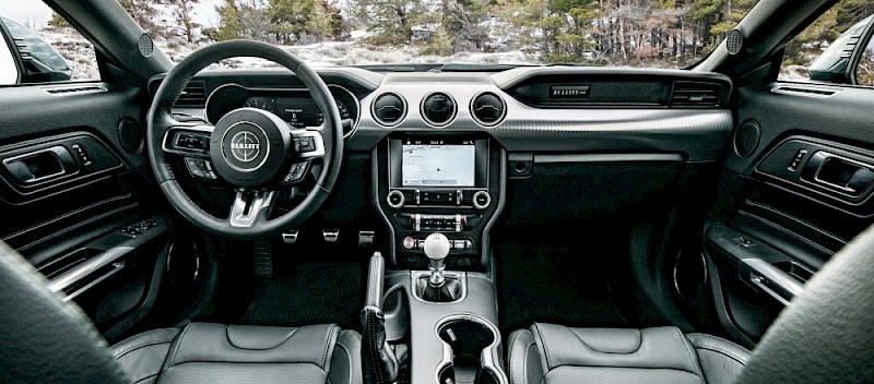 Az utastér meghatározó elemei a 12 colos, digitális LCD műszeregység és a Recaro sportülések. Az ülések, a középkonzol és a műszerfal-panel burkolatának varrásai ugyanolyan színűek, mint a karosszéria fényezése, és a műszerfal utasoldali részén a szokásos Mustang-embléma helyett a Bullitt változatba egy egyedi sorszámozással ellátott plakett kerül.